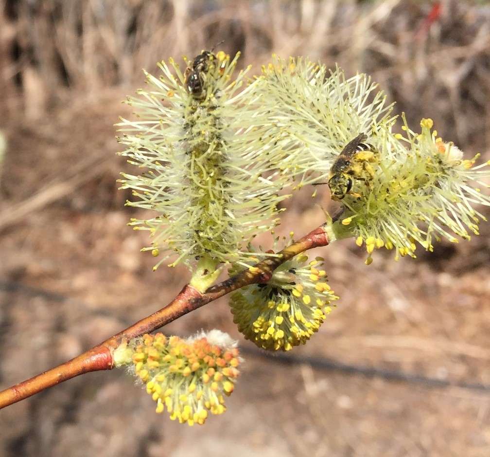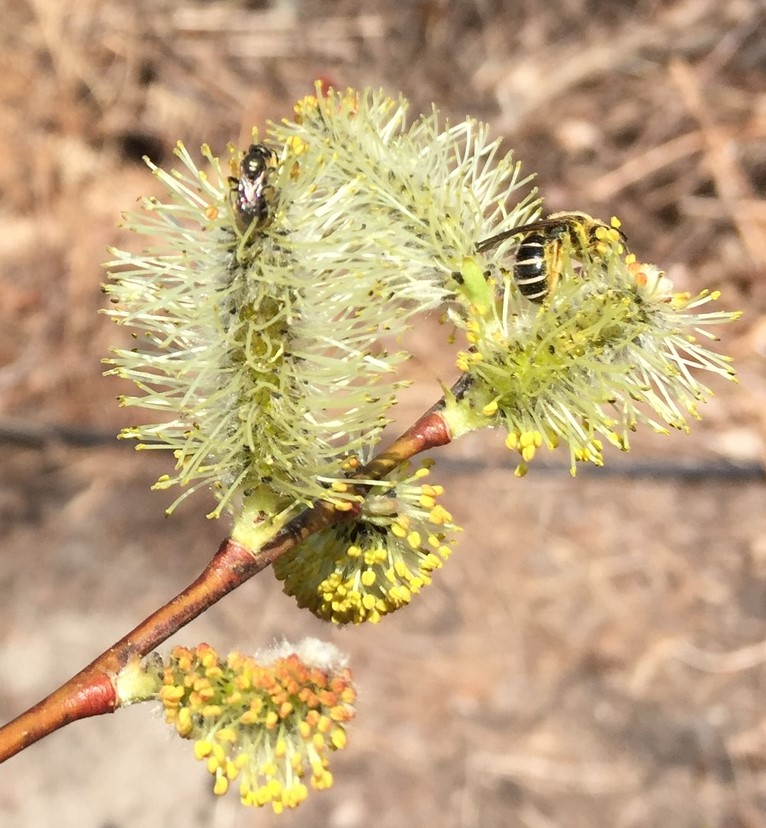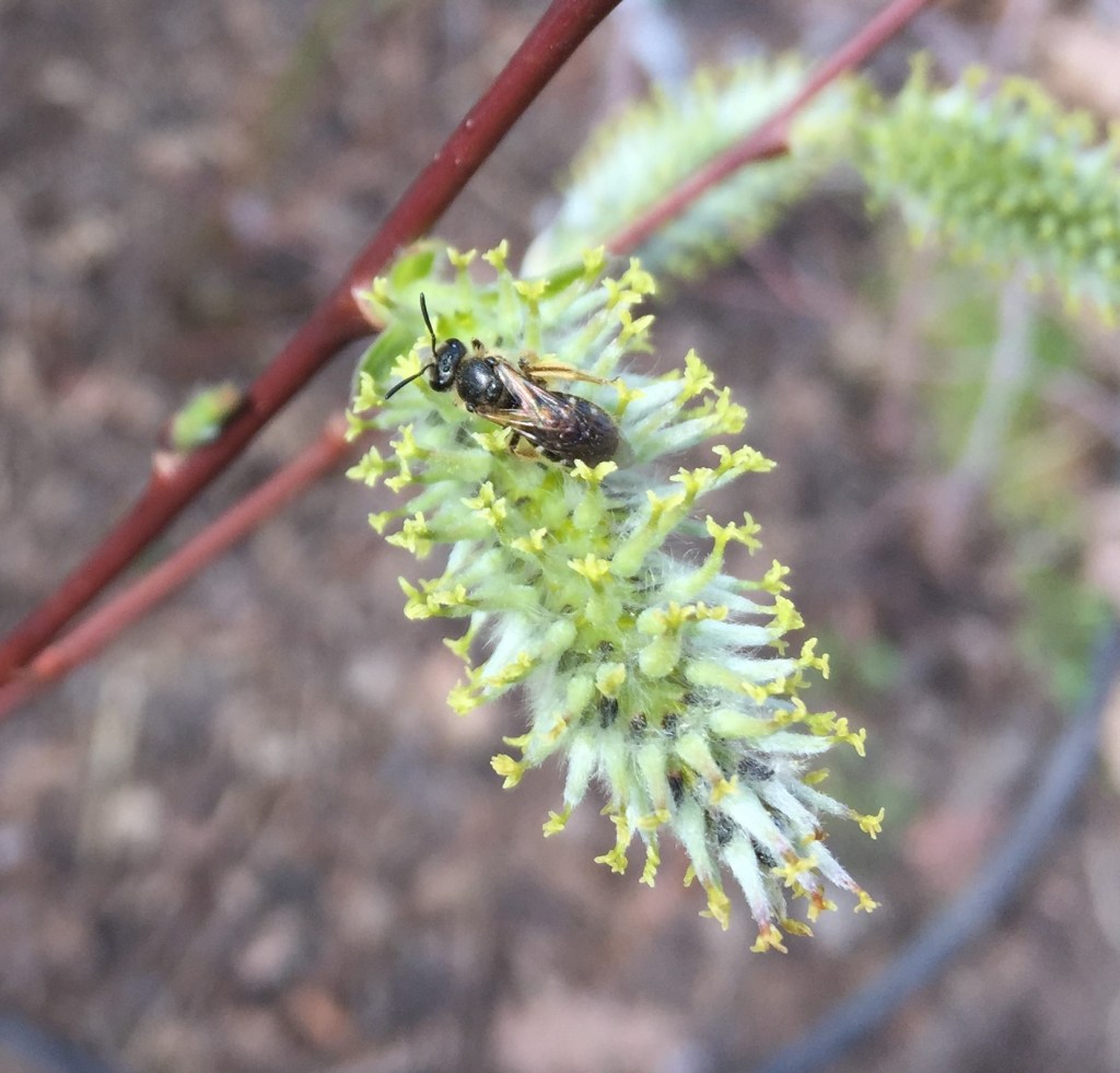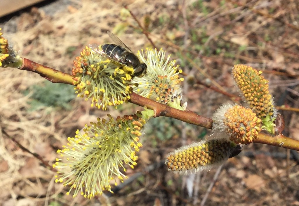 Pussy willow catkins, bulbs, and spring ephemerals appeared on cue. The pussy willow shrubs were the star attraction for pollinators. Here’s a video of the tremendous pollinator activity on my largest pussy willow; there are mining and cellophane bees, flower flies, and a few honey bees. Oddly, I have never seen a single bee on my hepatica or bloodroot.