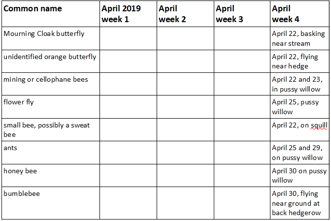 April 2019 was quite cold and rainy. It seemed to drag on forever. Earth Day, April 22nd, fell on Easter Monday, so we all had the day off. It turned out to be the warmest day of the month, and a perfect time to watch the first bees and butterflies in our yard.