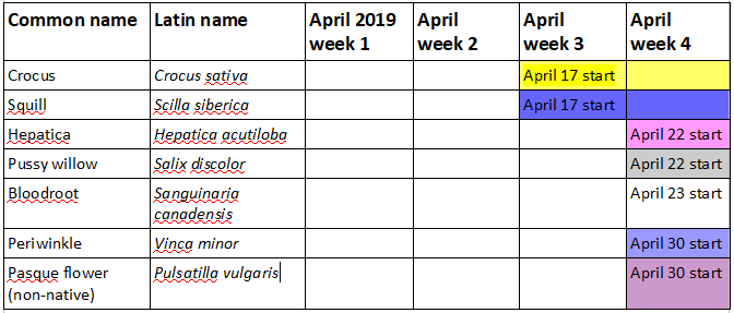 I want to start tracking what’s going on in my front and back gardens. This information will help me ensure there’s always something in bloom for pollinators. It will also be useful for planning future changes to my garden beds. My table format is a simplified version of the Minnesota Wildflowers What’s Blooming pages.