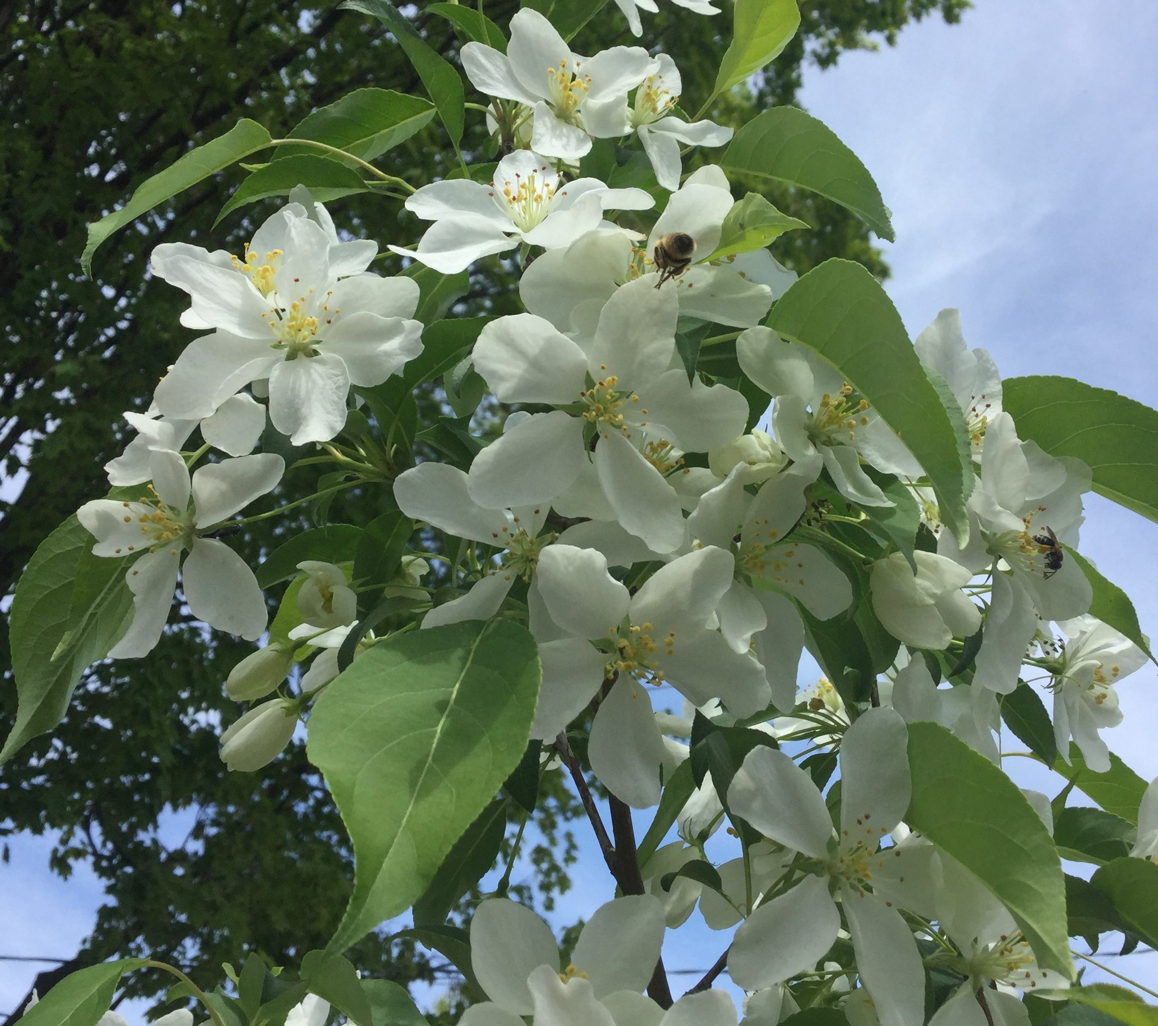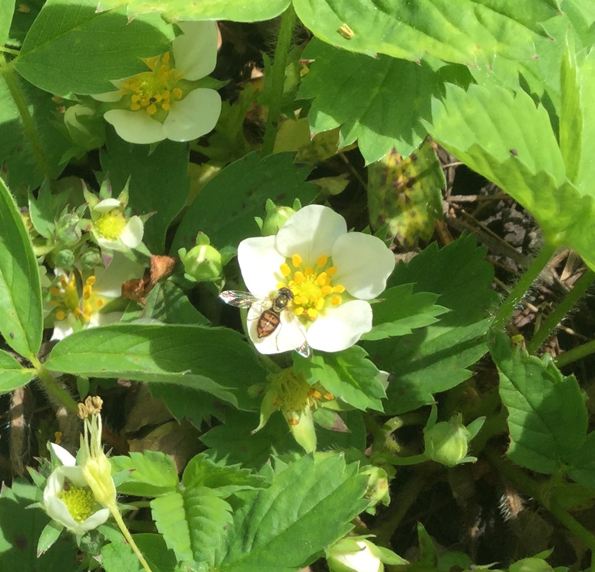 For smaller native bees and other pollinators, the winners were serviceberries, crabapples, and wild strawberries. It looked like some native bees were nesting under the plentiful strawberry plants that I use as ‘living mulch’ in my hedgerow. Perhaps they preferred foraging close to their nests instead of flying up to the shrubs and trees.