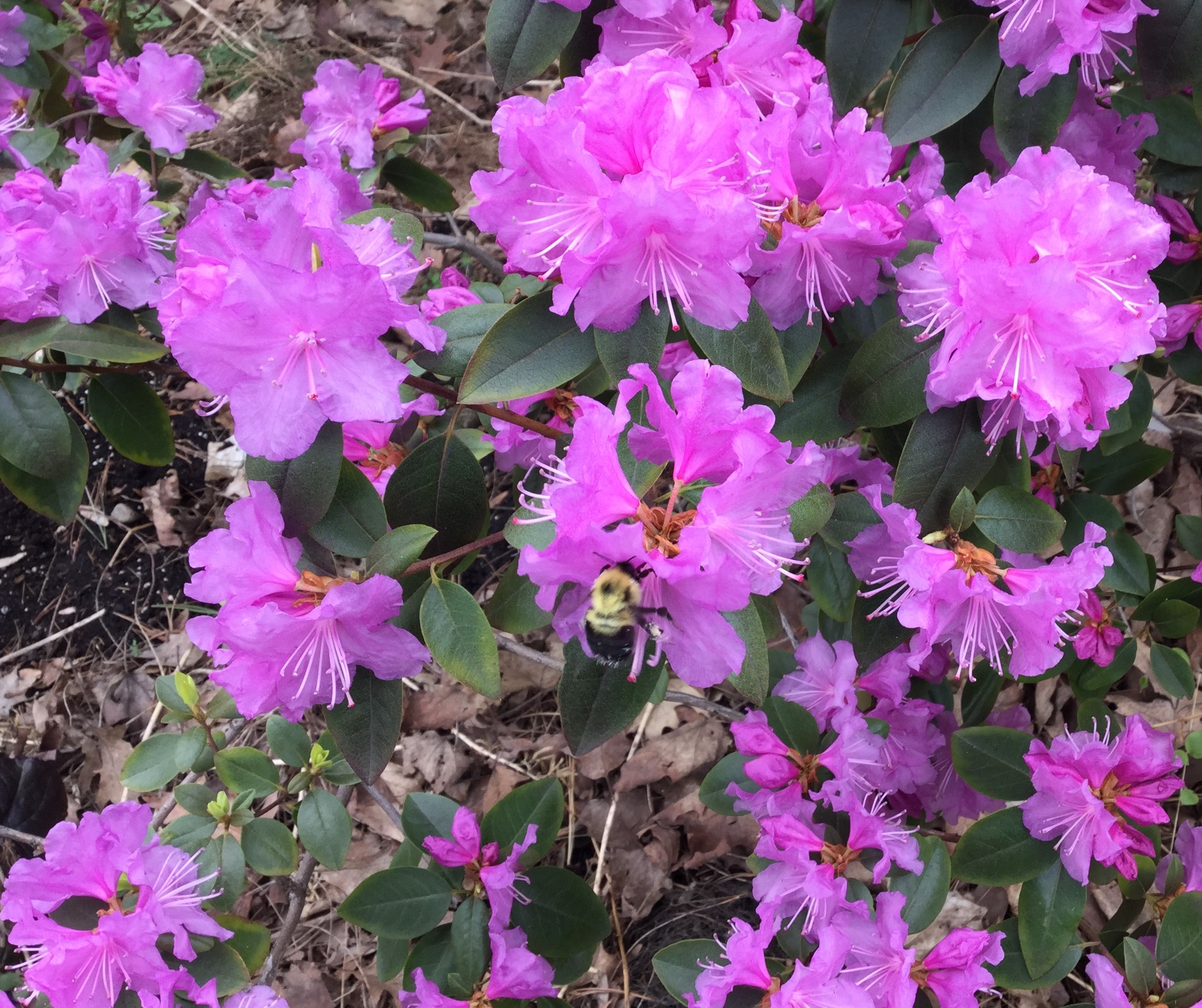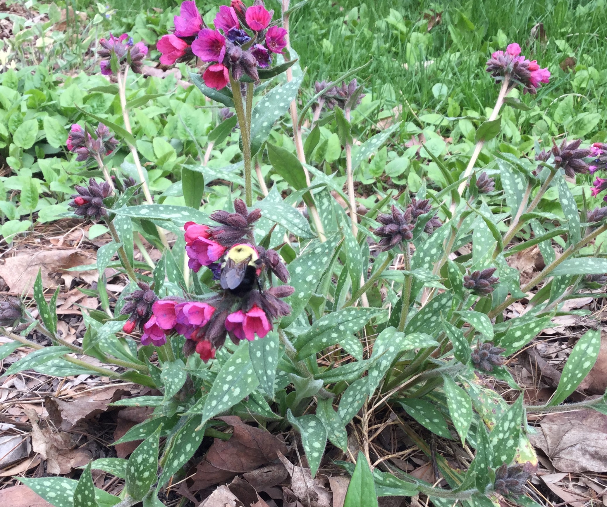 In May, the popular flowers for queen bumblebees were on my ‘PJM’ rhododendron, long-blooming lungwort, and crabapples. The bumblebees liked the flowers so much that they even visited them after they had dropped onto the ground. While I was watching, to my surprise, the queen bumblebees ignored my native perennials, shrubs, and trees.