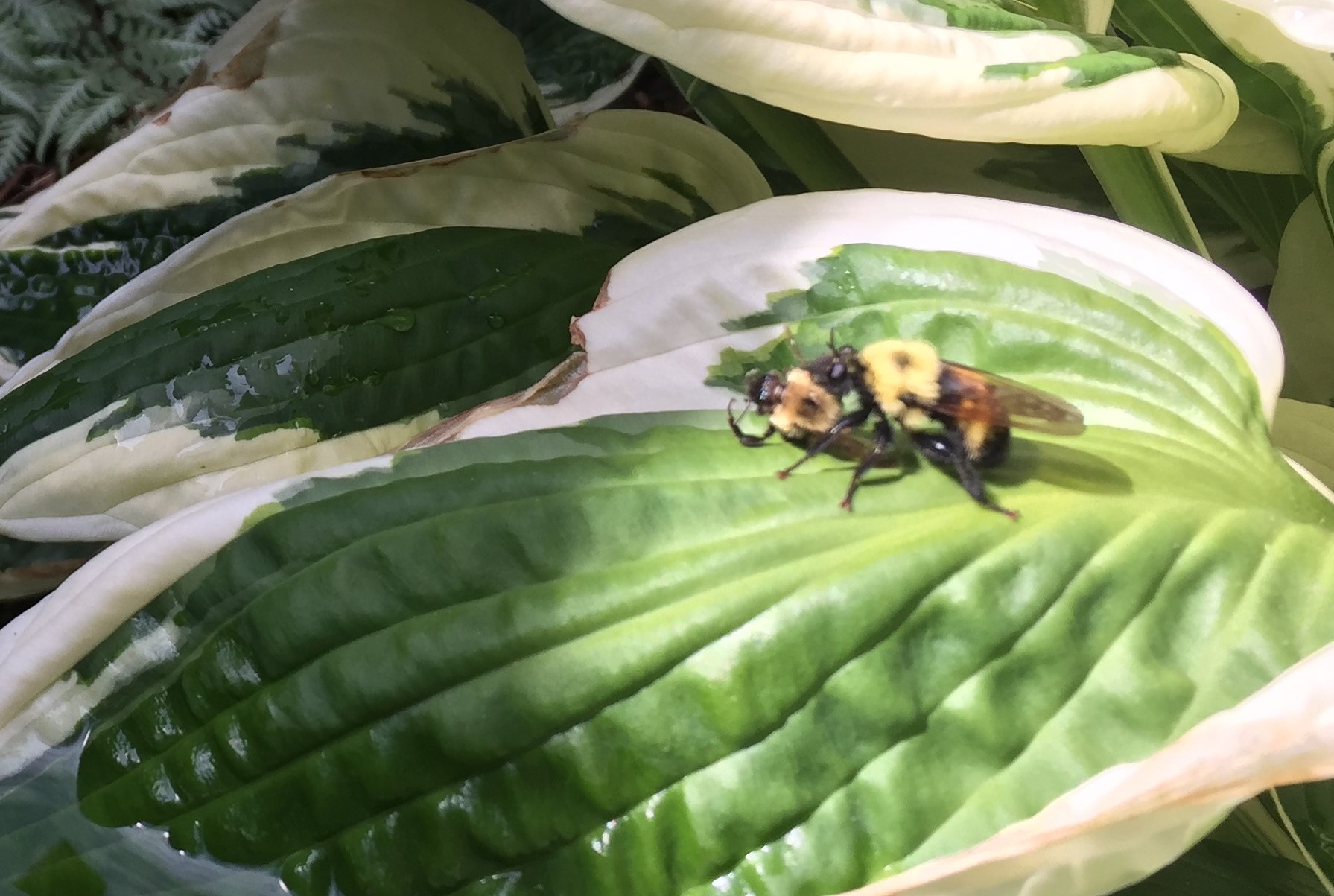 One day I noticed a large bumblebee, maybe a queen, carrying another bumblebee. In the book A Sting in the Tale (at the Ottawa Public Library), by Dave Goulson, I had read about internal bumblebee nest conflicts, but never about a queen carrying a worker away. So strange.