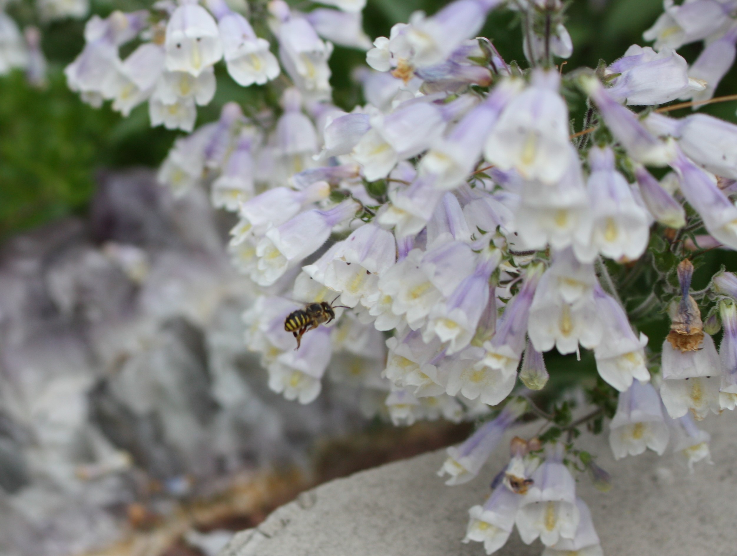 I first blamed male European Wool Carder bees for chasing all the bumblebees away. I really do dislike them and their bullying behaviour. Male Wool Carder bees choose an area with abundant flowers and patrol it, so females they mate with will have a secure supply of food. This year I had multiple males claiming territory in my front and back gardens. They rammed and chased each other, as well as other bees. Here’s a Youtube video, Wool carder bee – defending territory, that shows a male bee driving away another bee. They are easy to spot because they have a distinctive hovering flight, and a stocky, hairless, striped body.