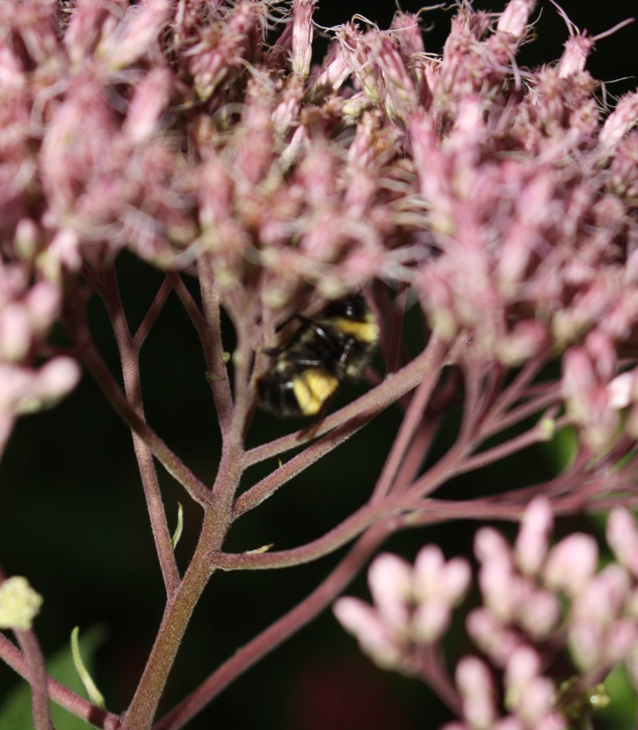 It is now August 21st. When I last saw our Yellow-banded Bumblebee, he was tucked under a Joe Pye weed flower — his favourite spot to spend the night. This morning, I’ll check on him to see if he’s still around. I know that adult bumblebees don’t live very long, so I cherish every sighting.