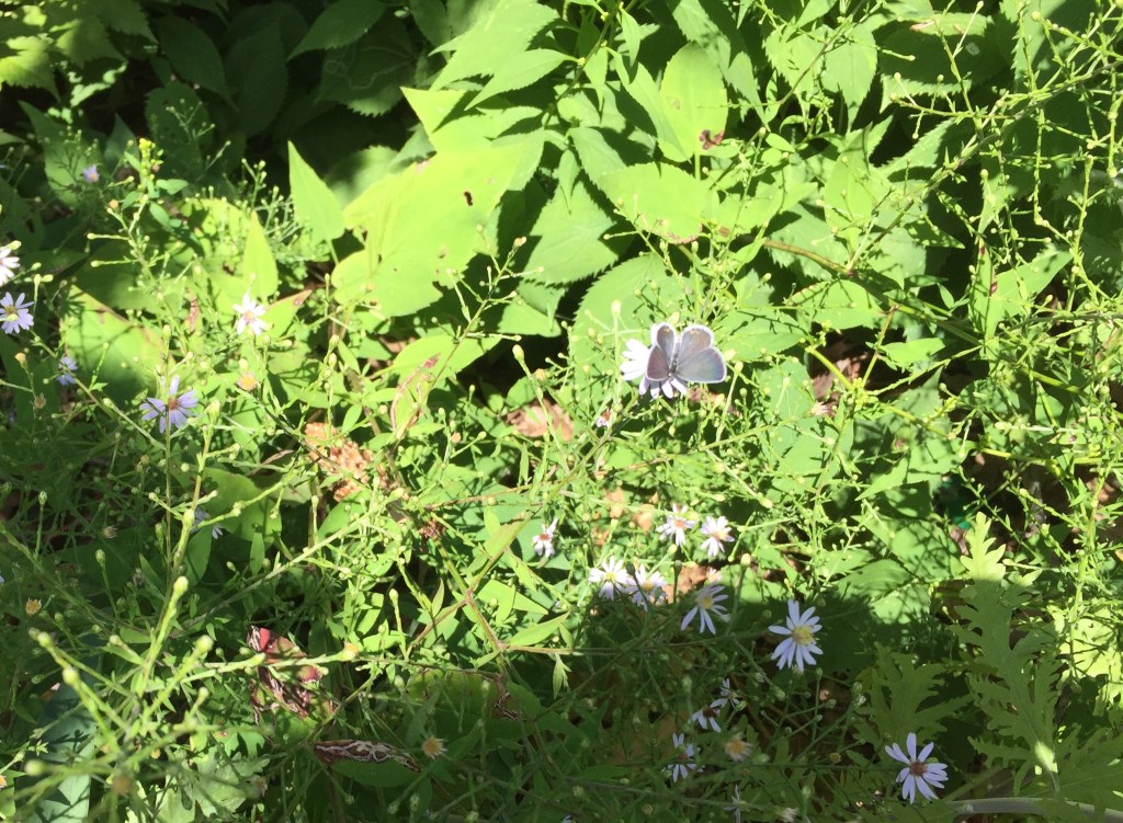 This summer, I spotted a tiny blue butterfly visiting our Heart-leaved Aster flowers. I managed to take a few pictures with my phone before it flew away. You can see how small the butterfly is compared with the equally small flowers of this aster.