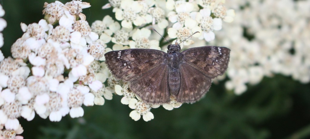 Here is another butterfly I had never heard of before — a Duskywing. It was drinking nectar from Mountain Mint flowers before resting on an adjacent yarrow. It is either a Coumbine Duskywing, which uses Wild Columbine as a host plant, or a Wild Indigo Duskywing, which uses, you guessed it, Wild Indigo. I have both host plants in the front pollinator garden where I found this butterfly, so that doesn’t help me narrow down an ID.