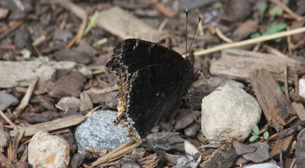 This Mourning Cloak wouldn’t pose with its wings open, so you can’t see the pretty blue dots that line the creamy edges of its wings. Like the Admirals, Mourning Cloaks also feed on sap and dung. They overwinter as adult butterflies, hiding under bark or leaves. Then, they emerge early in spring, even before flowers are in bloom, which may explain their unusual food preferences.