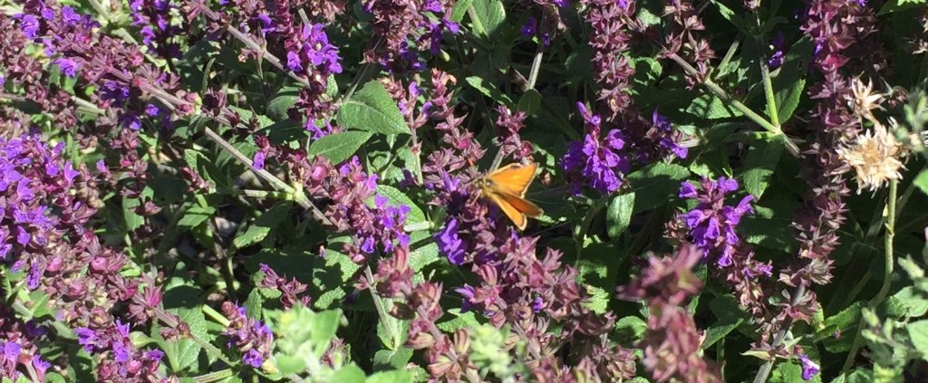 Every once in a while I found Skippers in the garden, too. They’re small, but quite distinctive-looking; they hold one set of wings up, and the other set out to the side. They use various native grasses as host plants.