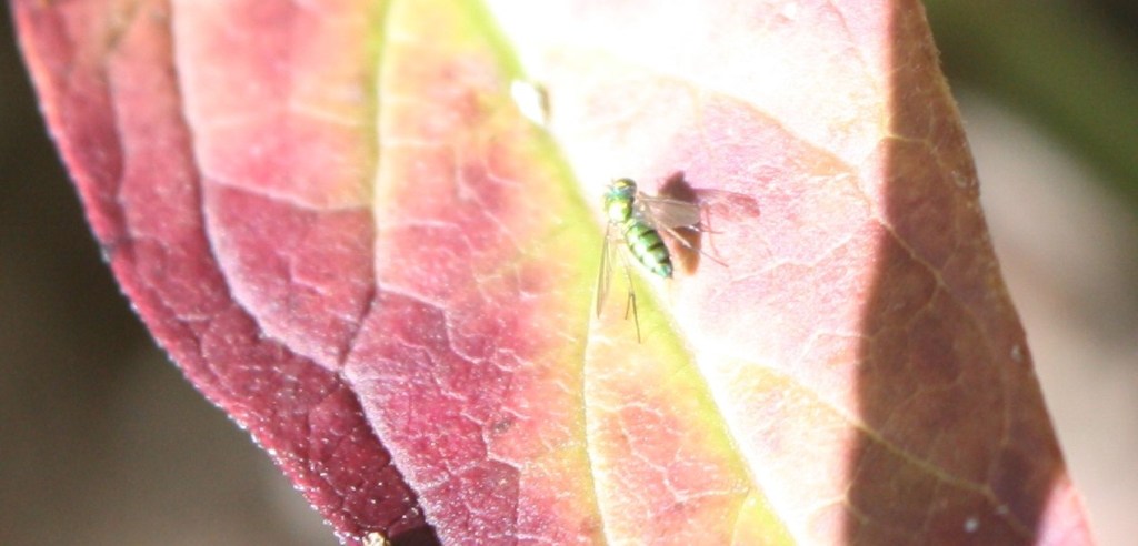 I had a lot of trouble identifying this very tiny, metallic fly. It isn’t a syrphid fly, it’s a Long-legged Fly. We’ve also seen ones that are metallic gold, instead of green. You can learn about them in this online article, the Long legged Fly. Like flower flies, adults visit flowers for nectar, and larvae eat soft-bodied insects. Their larvae camouflage themselves by incorporating surrounding debris while making their cocoons.