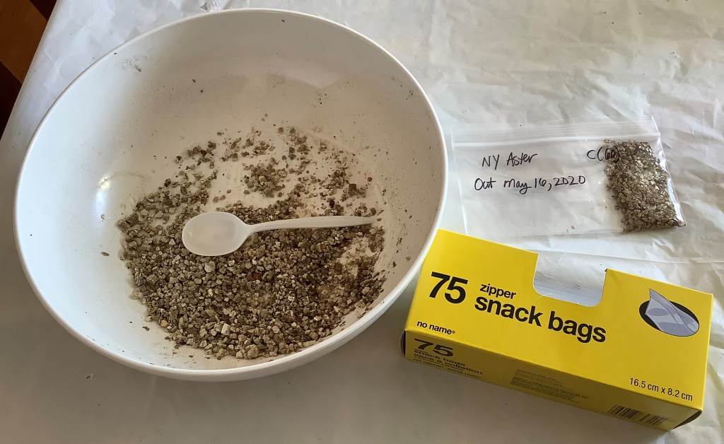 I added the seeds to baggies, along with 2 tablespoons of moistened vermiculite. I then labeled each one with the seeds’ common name, and the date it should come out of the fridge.