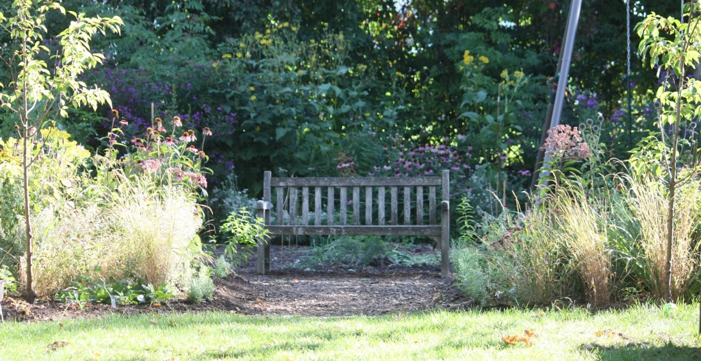 The mini-meadow has attracted tremendous numbers of insects and birds. The bench is the perfect place to sit and admire the flowers, and watch the wildlife.