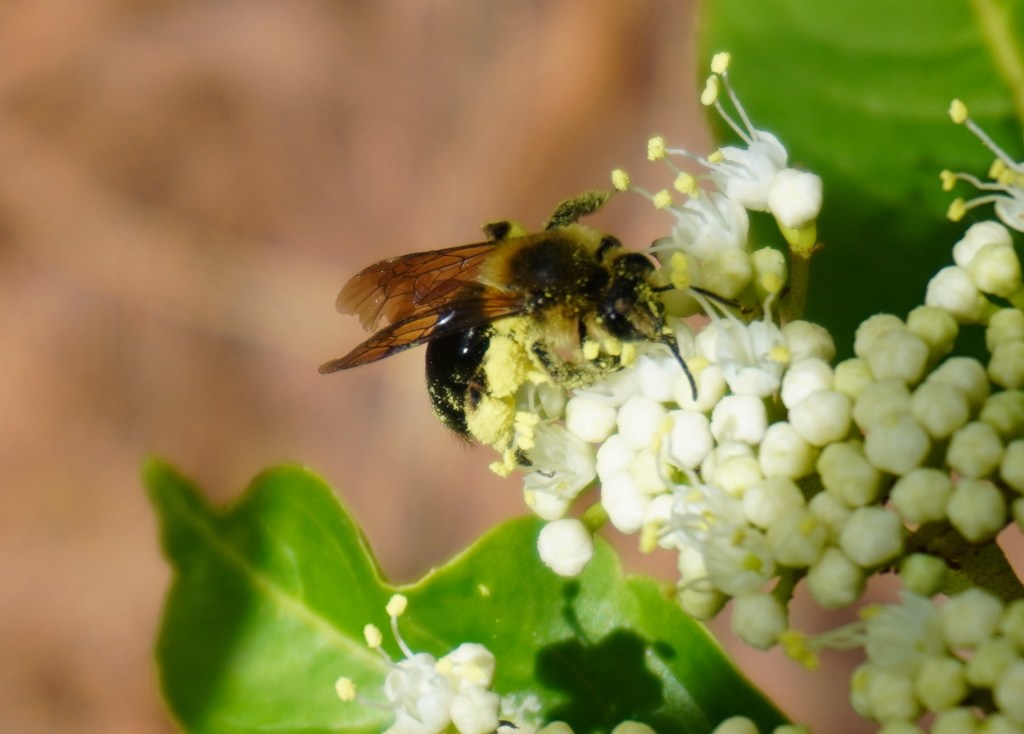 According to Heather Holm’s Houzz article Invite Mining Bees to Your Garden by Planting Their Favourite Plants, some kinds of mining bees will also emerge in the fall. Many are specialists, gathering pollen from only one species of native plant, such as asters and goldenrod, to provision their nests.