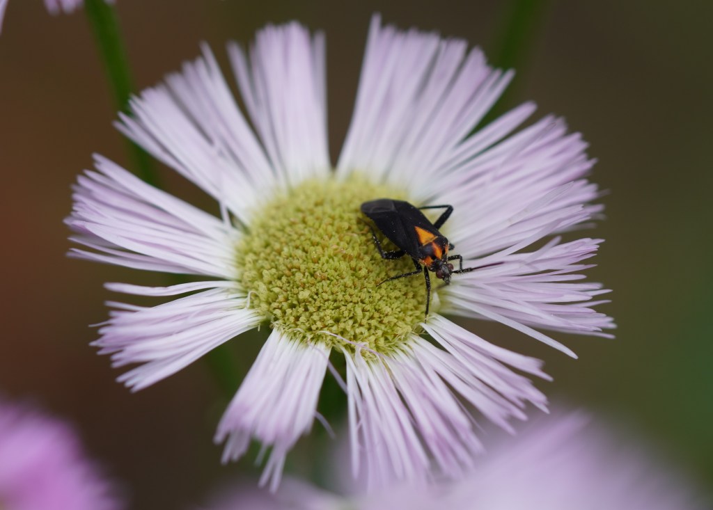 Here are two other insects that visited the Philadelphia Fleabane flowers while I had my camera. The first one looks like some kind of beetle, and the second one is so tiny that it looked like a spec of dirt to the naked eye.