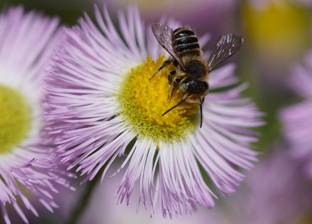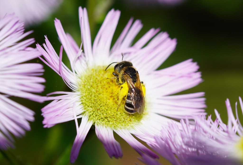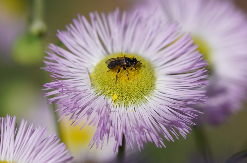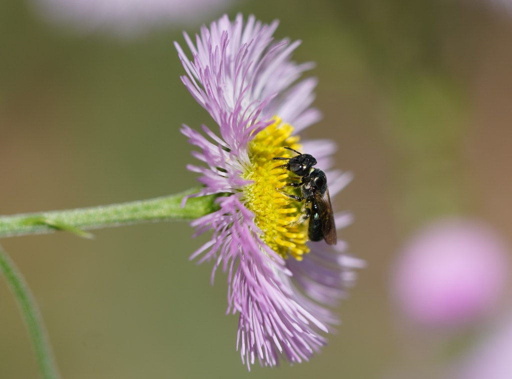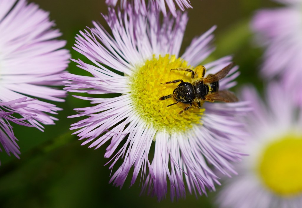 Most of the pollinator activity in the back garden is at Philadelphia Fleabane flowers right now. I’ve spotted so many different insects that I’ve divided my photos into 3 different posts. Here are a variety of small bees; bumblebees have zero interest in the flowers.