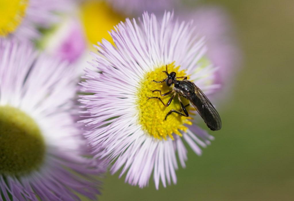 There have also been different kinds of flies at the Fleabane flowers. I believe that they’re all flies because their heads are almost all eyes, and they have very short antennae.