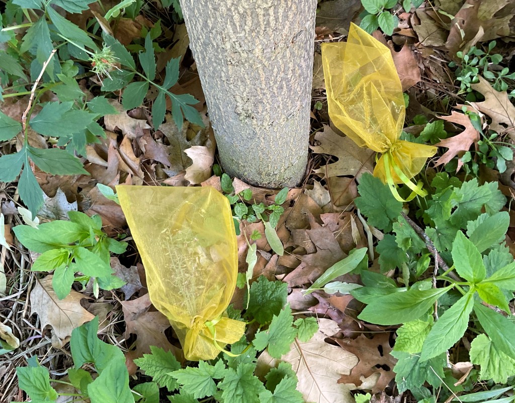 I use organza bags to collect seeds from some other plants. I’m not really sure when to collect Foamflower seed (3rd photo), so the bags will catch them whenever they drop off. Wild Geranium seeds shoot out of the seed pods when they’re mature, so the bags are useful for catching them too.