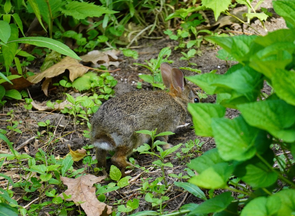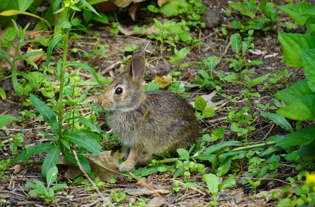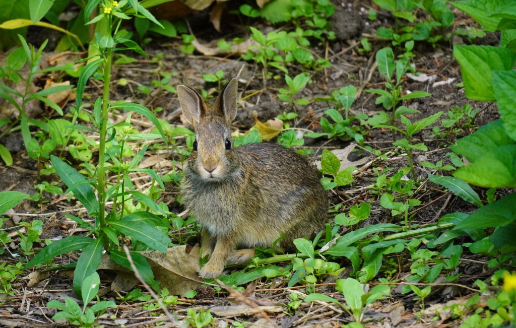 Lately, we’ve been seeing a cute baby bunny in the garden. Here it is helping me out by eating a weed.