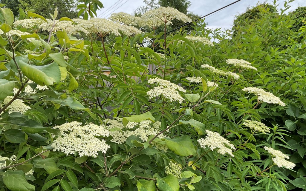 The Common Elderberries are in full bloom in the back hedgerow, and Red Elderberries are in full fruit in the front shade garden.
