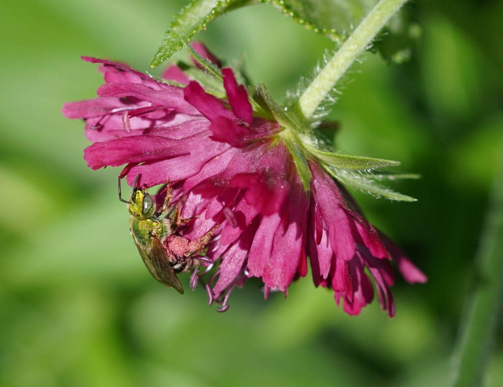 Over the past couple of years while taking insect photos, I’ve noticed that flowers produce pollen in different colours. The Red Pincushion Flowers have pink pollen (photos 1 and 2), daisies have bright yellow pollen (3rd photo), my Explorer Rose has pale yellow pollen (4th photo), and Purple Prairie Clover has bright orange pollen (underside of Leaf-cutter Bee in 5th photo).
