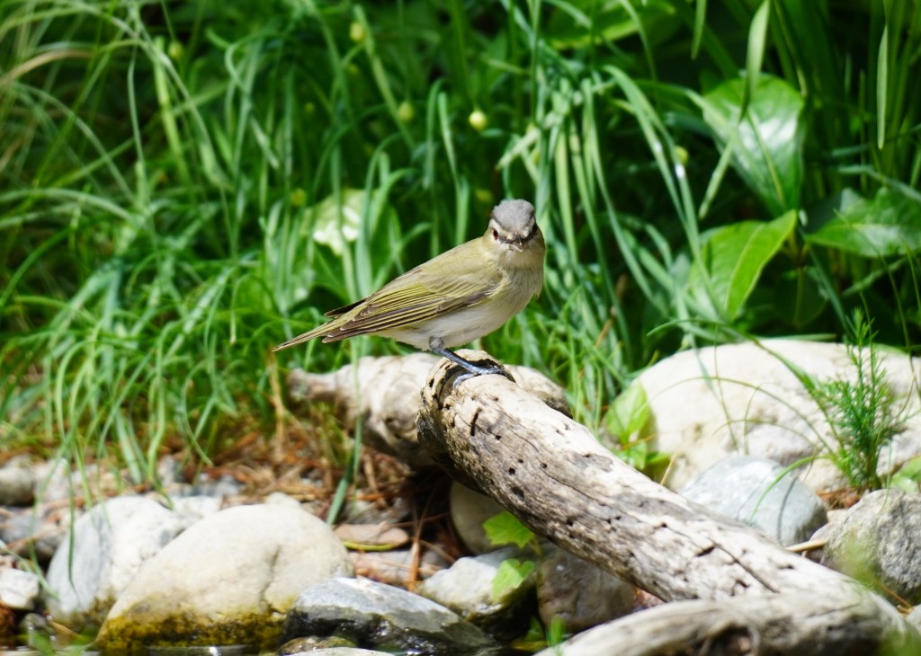 Red-eyed Vireos win the prize for most ridiculous bathing style. I call it ‘silly dipping’. They dive into the stream, skimming the water surface, and then zooming back out as quickly as possible. The Robins — who bathe leisurely and repeatedly, even just sitting in the water for extended periods — must think the Vireos are crazy.