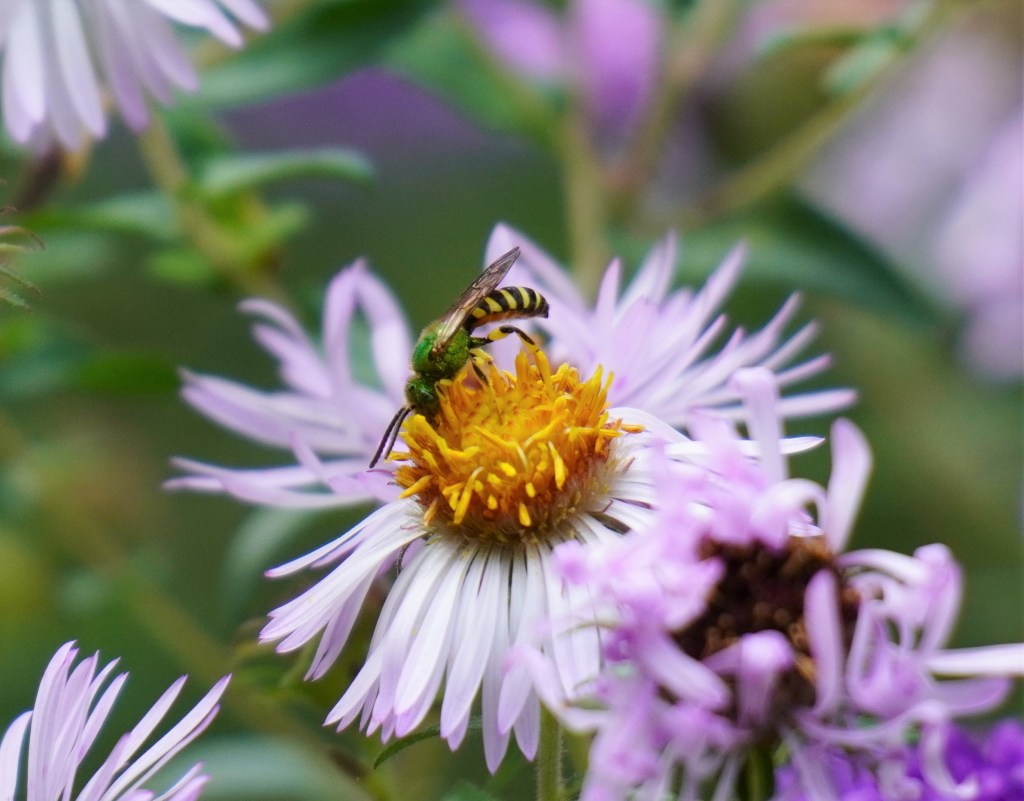 The New England Asters were at their peak in mid-September. Now they’re waning and the Smooth and Aromatic Asters are starting to bloom. New England Aster flowers vary in colour. Some are darker purple, while others are pinkish or almost white. The bees enjoy them all.
