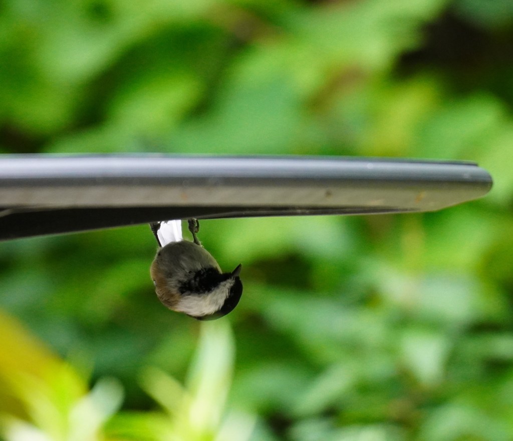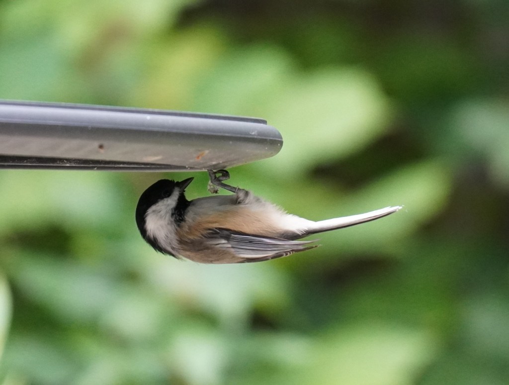 While the early bird gets the worm, the curious Chickadee gets the spider. I really can’t tell what kind of insect this little Chickadee found, but it must have been tasty because it spent quite a while poking around under our bistro table looking for more.
