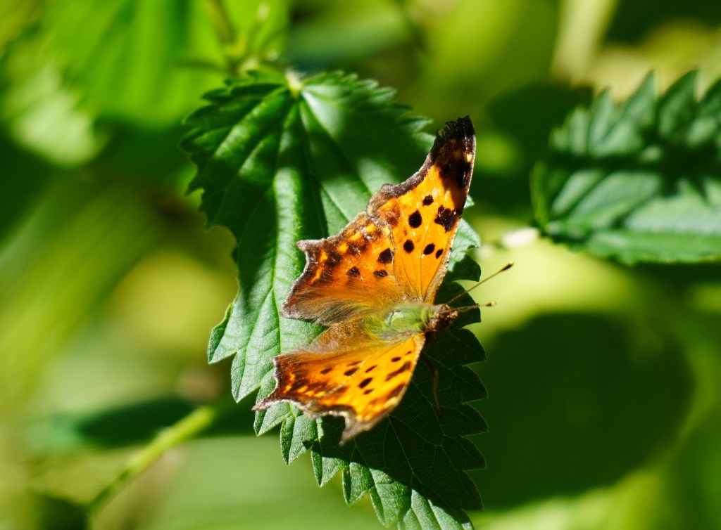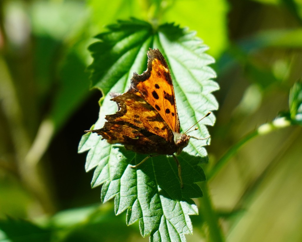 This Comma is sitting on its host plant, Stinging Nettle. Each time I get stung by this plant, I resolve to dig it all out. Now, I guess I will put up with it. It’s interesting that the butterfly is sitting on Stinging Nettle, even though it wouldn’t be laying eggs on it until the spring. Perhaps it intentionally overwinters near its host plant to prepare for next spring.