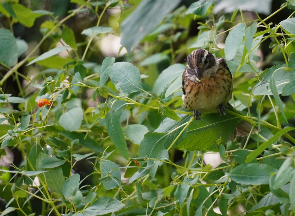 Much to my surprise, I did get photos of a Rose-breasted Grosbeak visiting my plants in the backyard. I had no idea what it was doing — eating flowers, insects? I learned that Grosbeaks eat Jewelweed seeds. In a few of my pictures, you can see seeds in its mouth.
