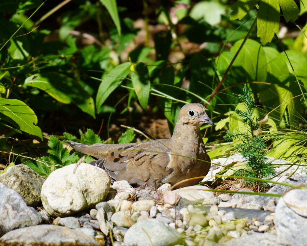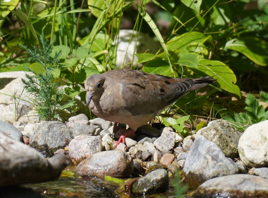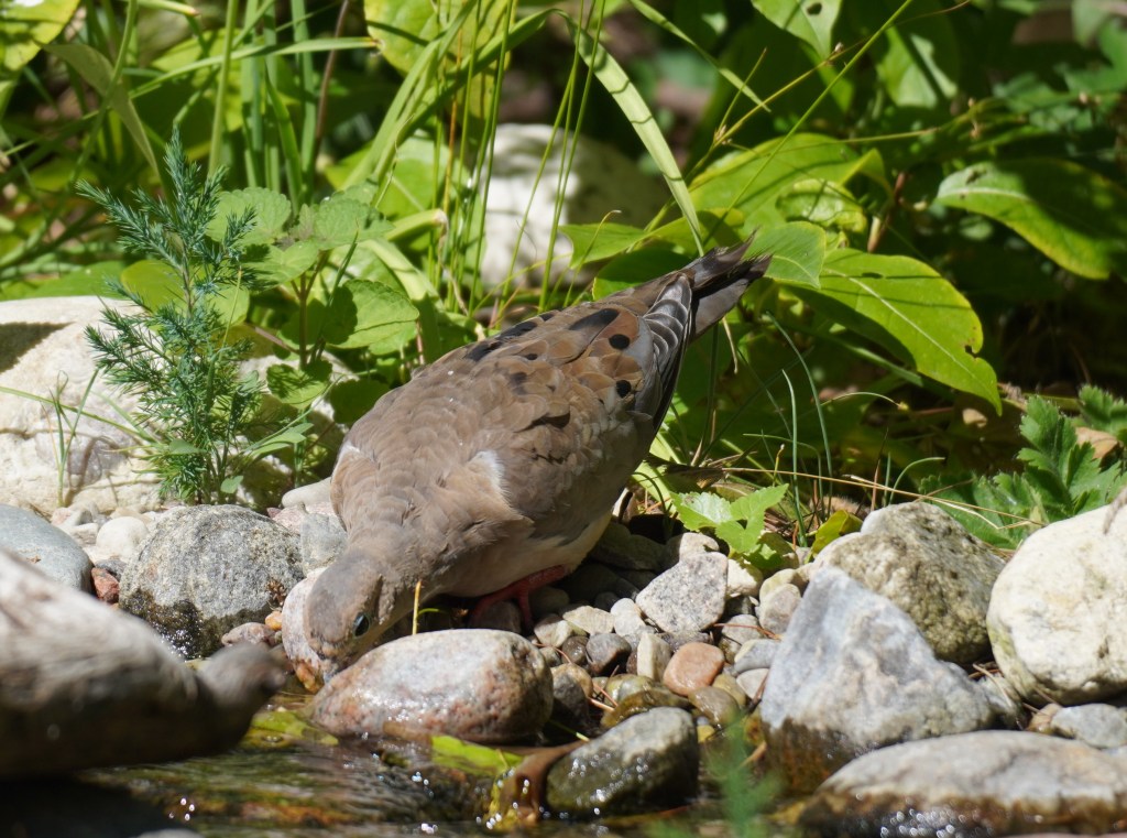 We don’t have Mourning Doves in the yard very often, even though they nest elsewhere in the neighbourhood. This particular bird has been here for a few weeks pecking around the ground for seeds and visiting the stream for drinks. I’ve never seen it bathe.