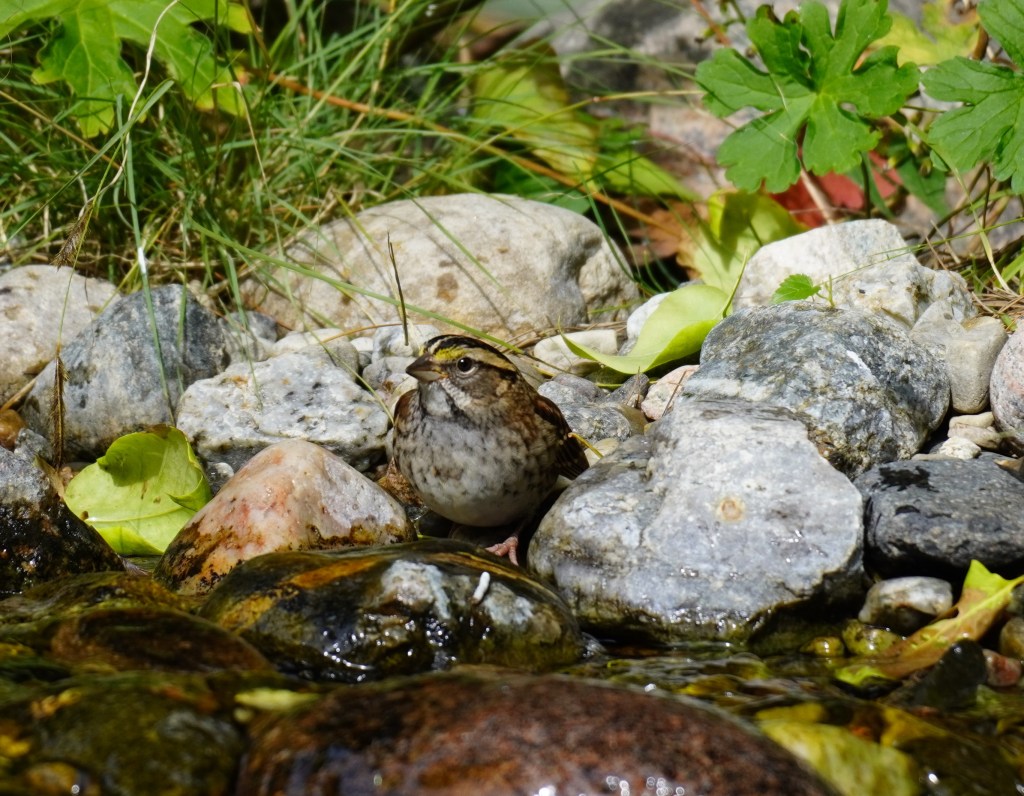 These new sparrows are delightful guests. They have a pretty little song, and boldly hop all over the yard looking for seeds. They’re also big bathers, using both the stream and the ground-level birdbath.