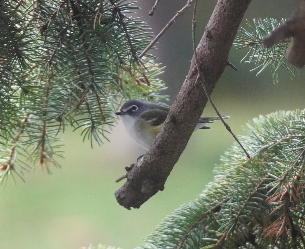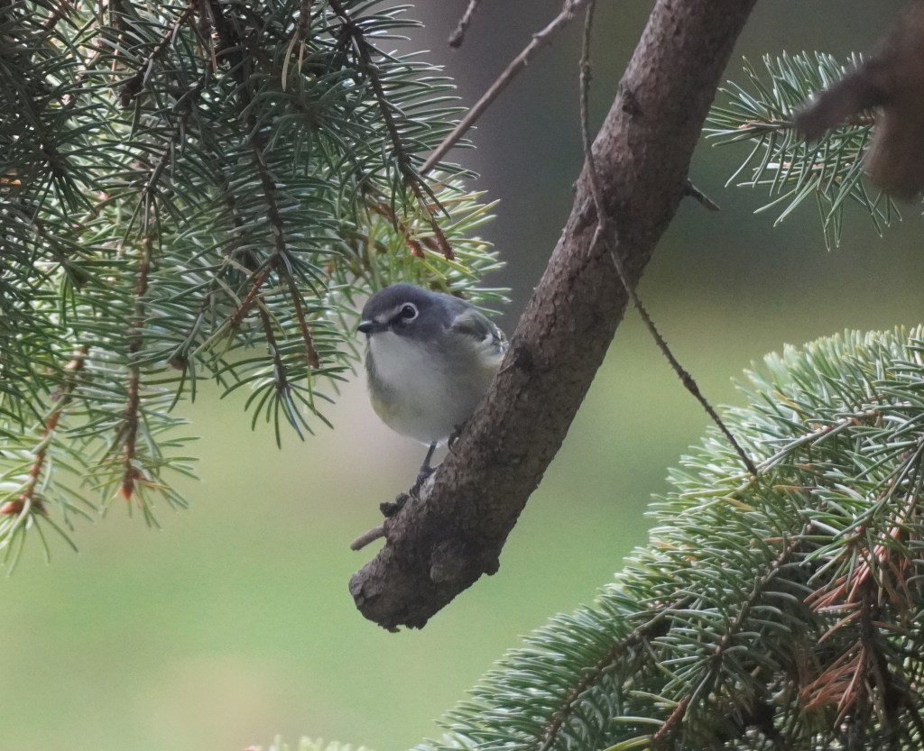 This late-migrating Blue-headed Vireo perched in our front spruce tree in between eating Red Osier Dogwood berries from the shrubs below (October 11, 2020).