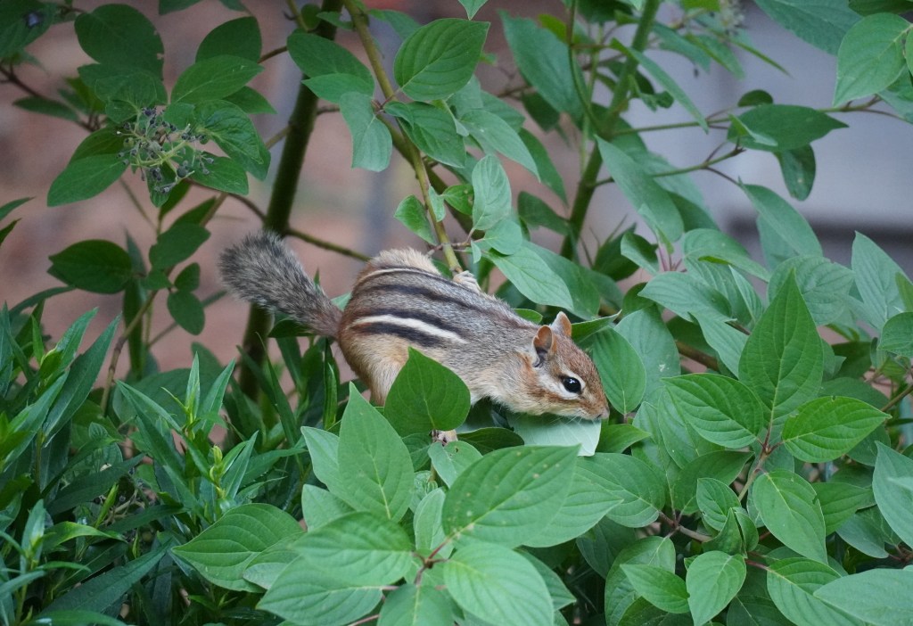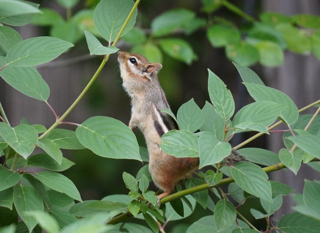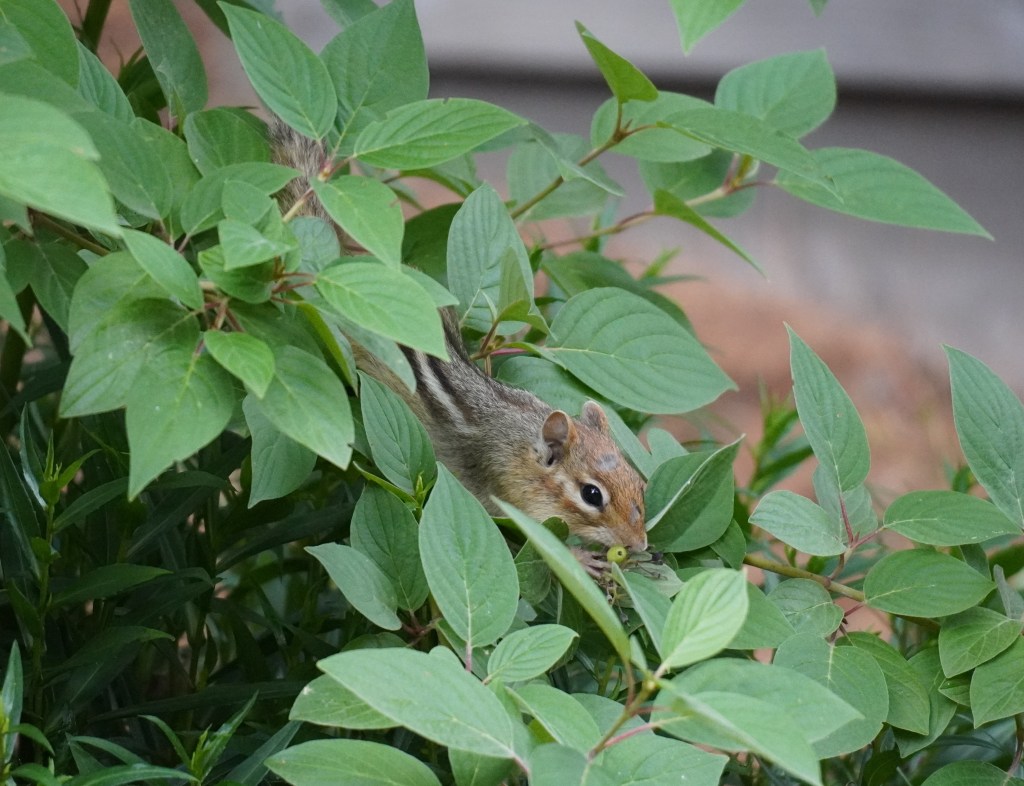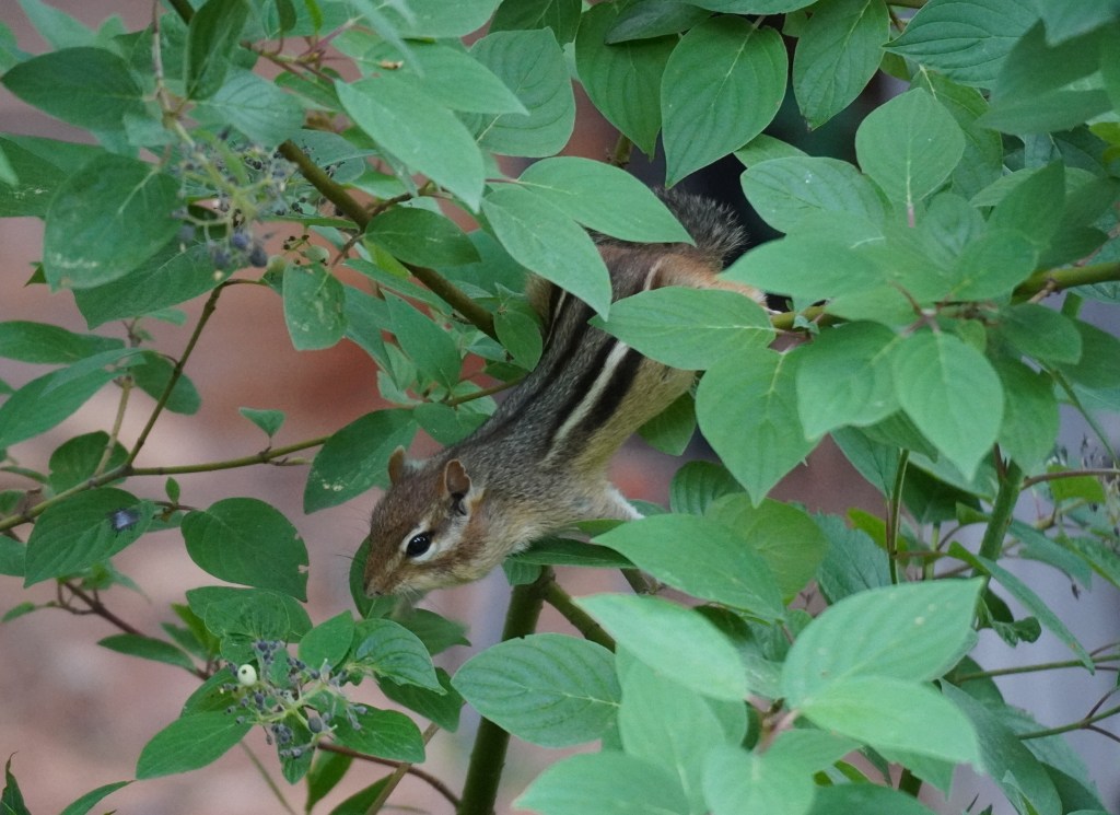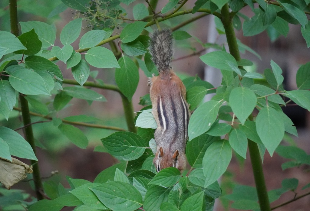 Chippy runs up and down the Red Osier Dogwood branches in search of berries (June 25, 2021).