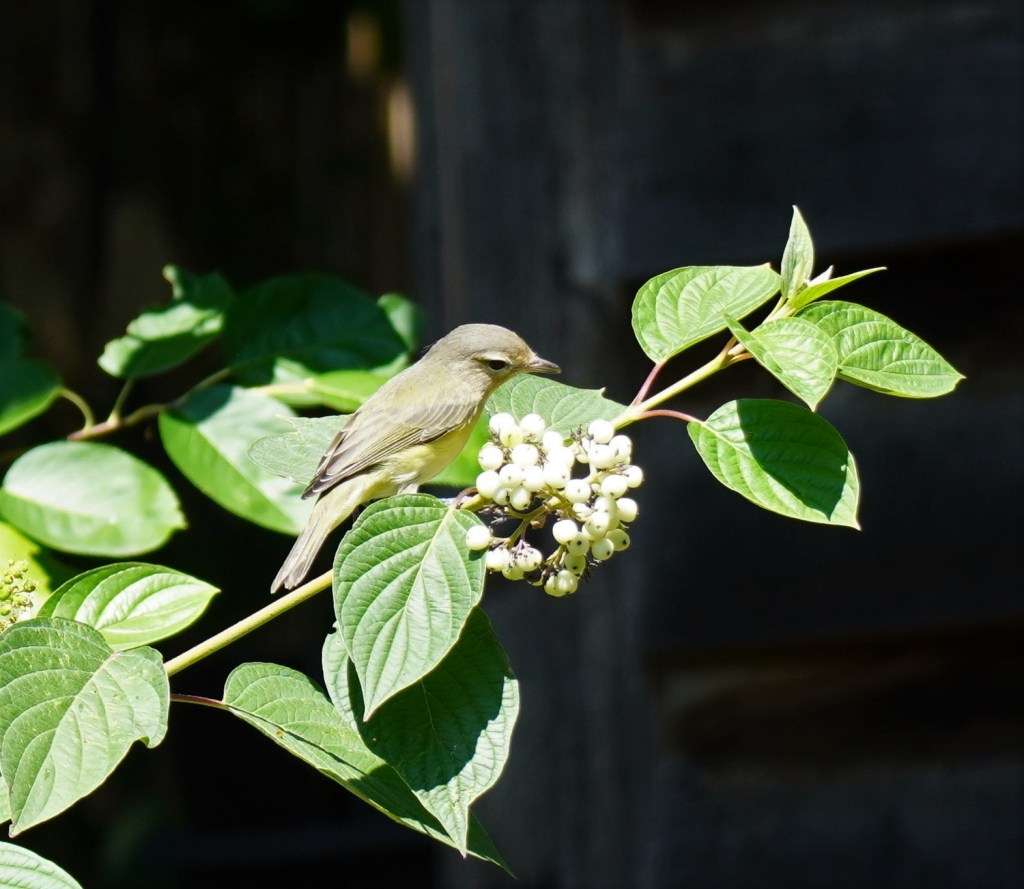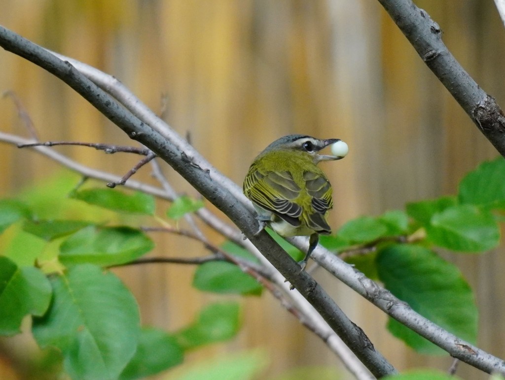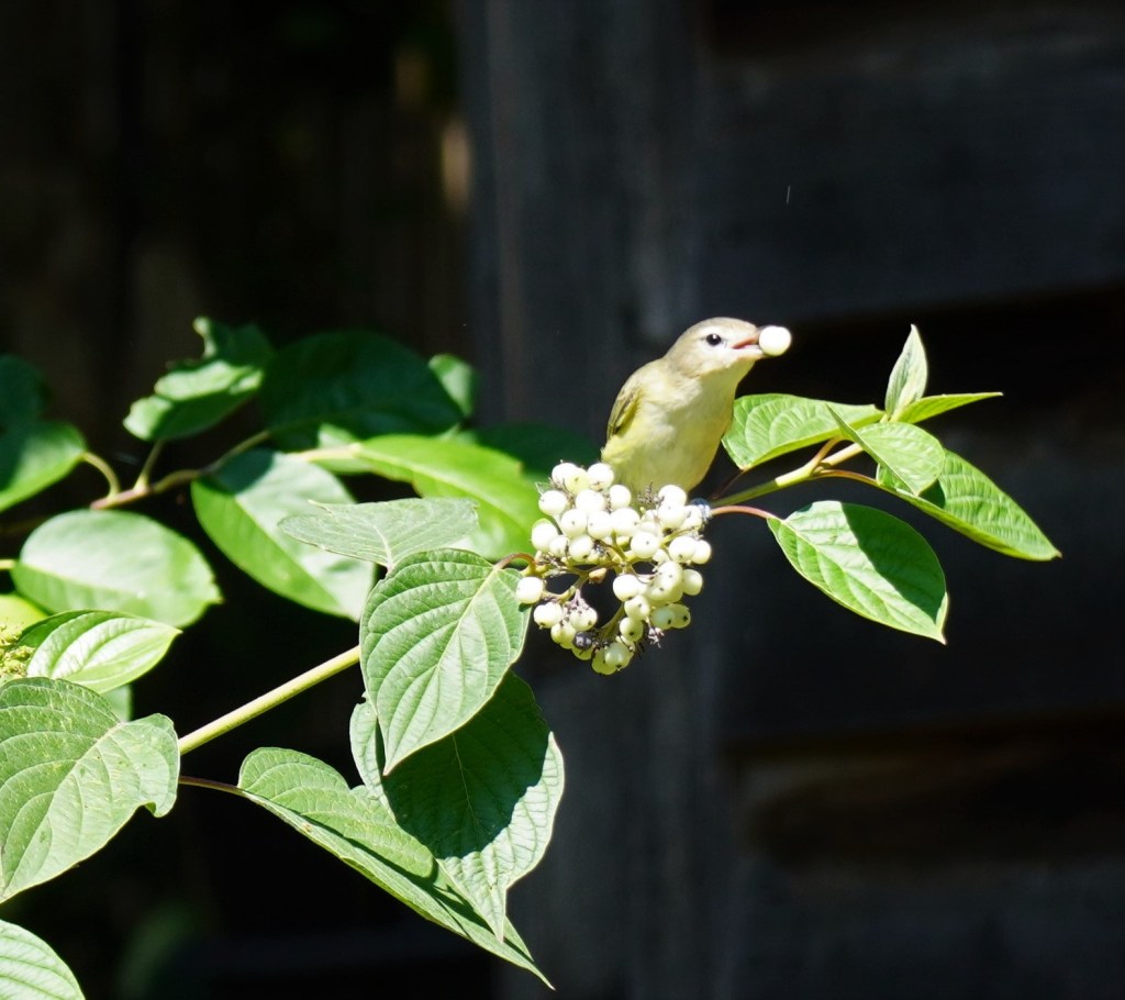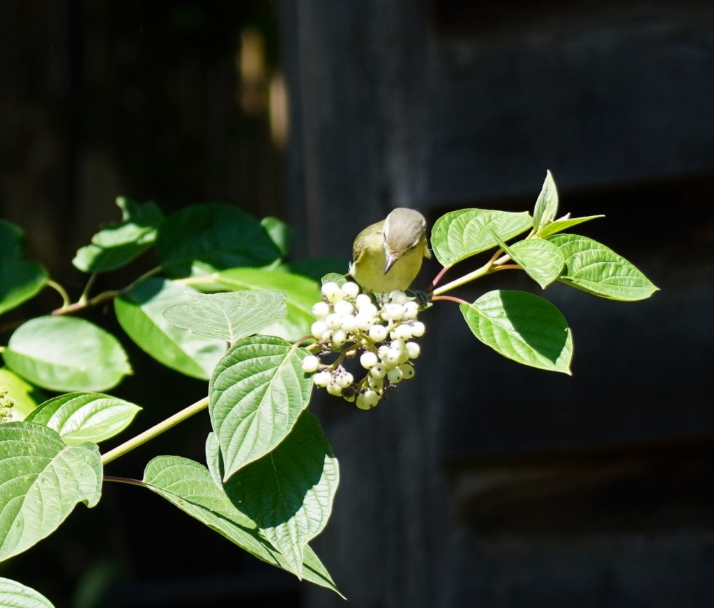 A Red-eyed Vireo eating Red Osier Dogwood berries (August 13, 2020).