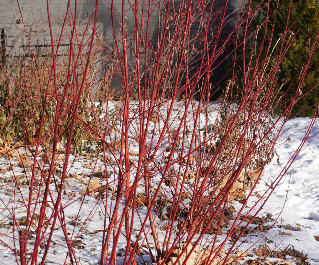 In winter Red Osier Dogwoods really earn their keep. It’s one of the few plants that add ‘winter interest’ to our Ottawa garden, even when we have several feet of snow. At this point, most grasses and attractive seeds heads keeled over long ago beneath wet snow or freezing rain. However, the bright red stems of Red Osier Dogwoods stand upright above the snow and gleam in the sunshine.