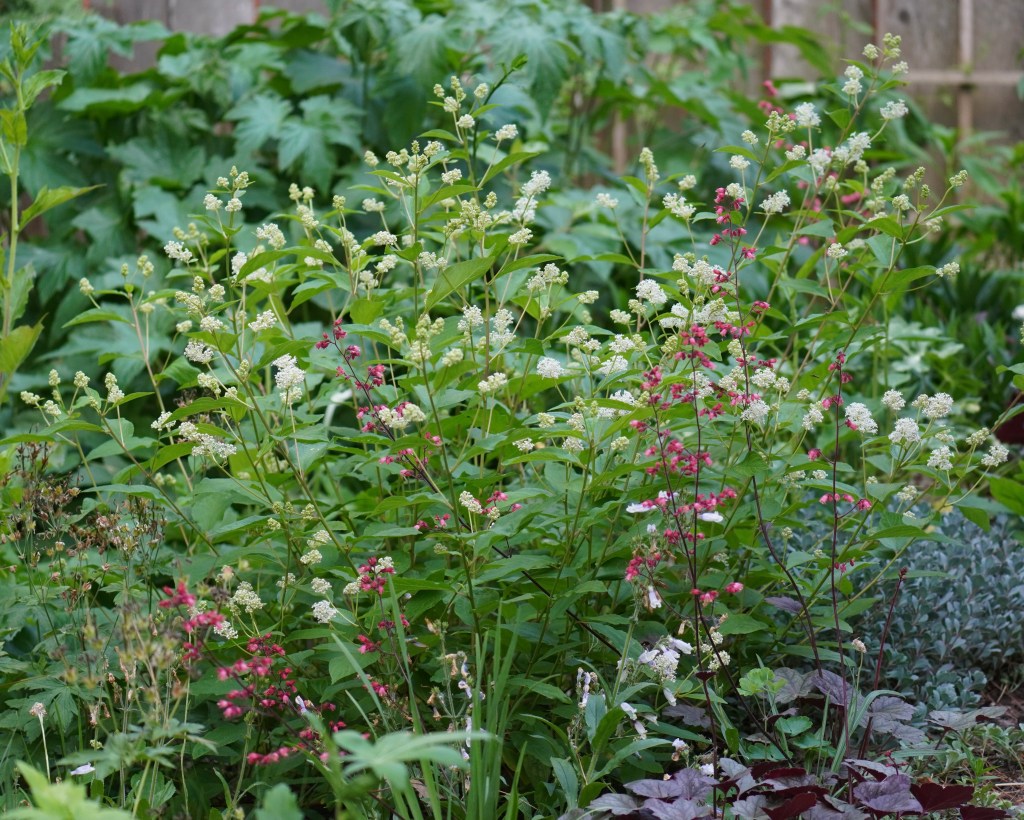 I planted my 5 New Jersey Tea shrubs next to our seating area, in the terraced garden. It’s pictured here with a variety of coral bells that has dark leaves and bright flowers — leftover plants from ornamental gardening days.