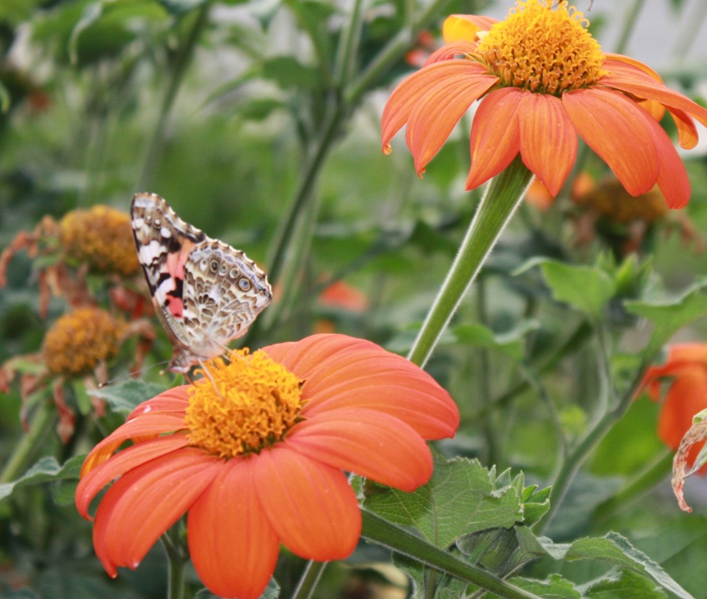 In my garden, there are two annuals that attract butterflies consistently — Brazilian Verbena and Mexican Tithonia. Mexican Tithonia is covered in bumblebees and migrating Monarchs and Painted Ladies in late summer.