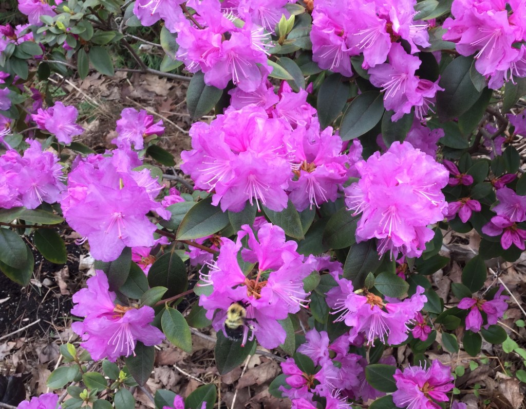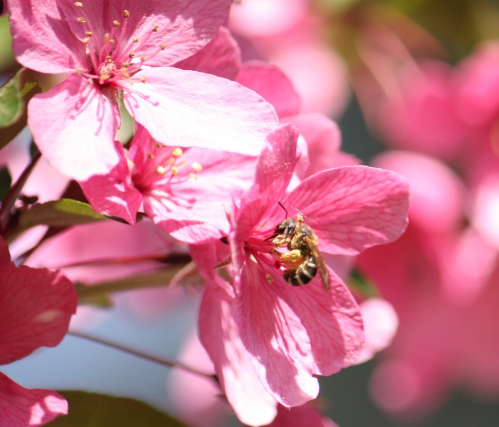 In my garden, I see a lot of bee activity on Pussy Willows and Red Maple in April, followed closely by Spicebush and Rhododendron. Then a lot of trees flower with overlapping bloom times: Wild Plum, Serviceberry, Chokecherry, Hawthorne, and various non-native crabapples. Most of my trees and shrubs are small, so I get a good eye-level view of the pollinator activity.