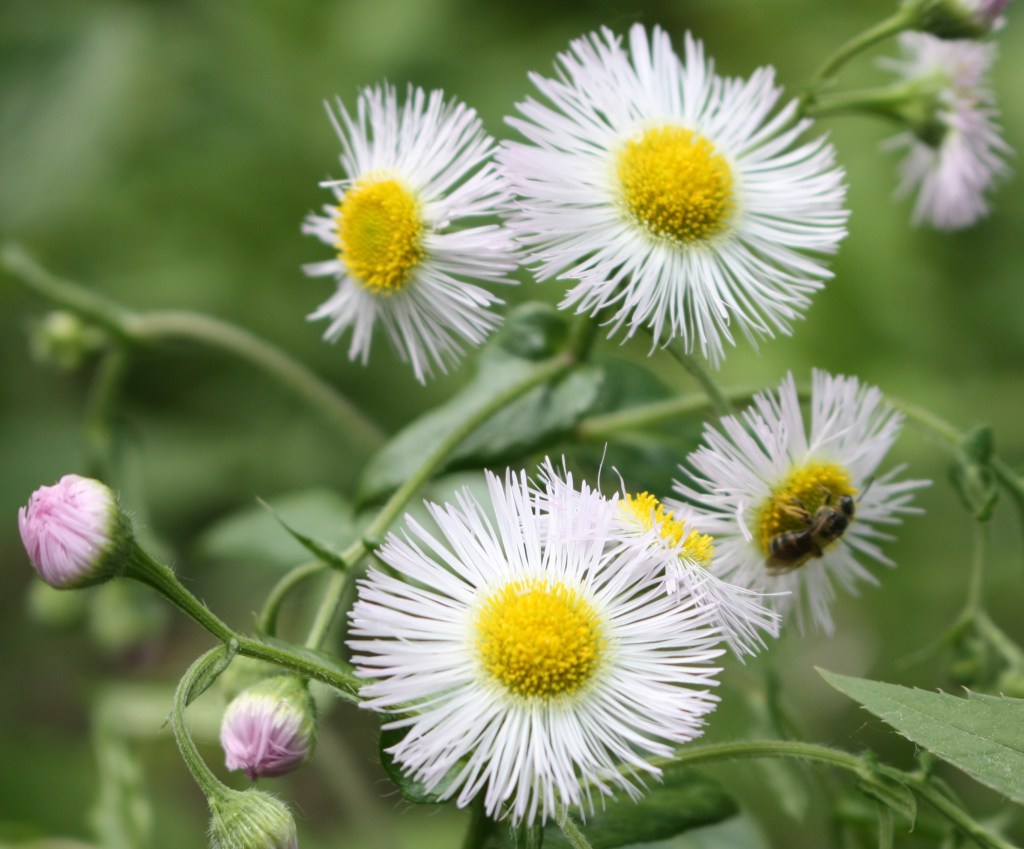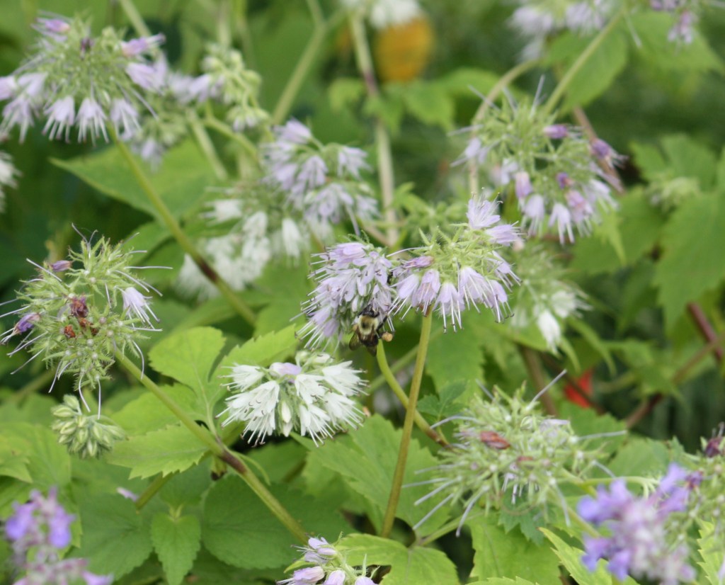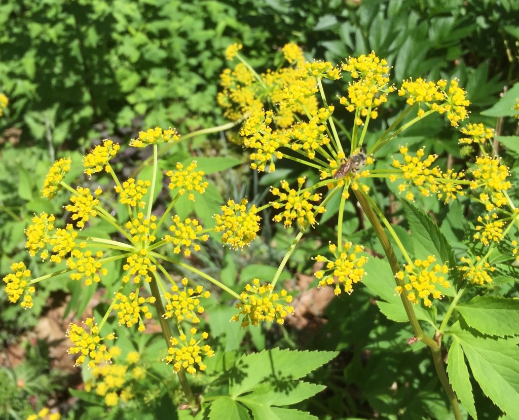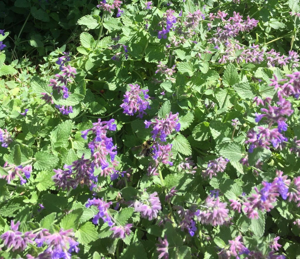 For a long time, I’ve had a gap in late spring when I had hardly any flowers. To fill the gap, I’ve added salvias, catmints, Canada Columbine (has a long bloom time), alliums and chives, and Golden Alexanders. I also let the Fleabane that self-seeded grow in a patch, and small bees and flower flies love it.